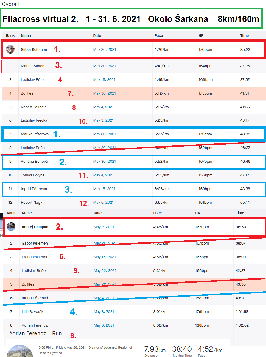 Organizátor 2.5.2021 zverejní výsledkovú listinu v kategóriách mužov a žien. Všetci účastníci dostanú online diplomy. :)